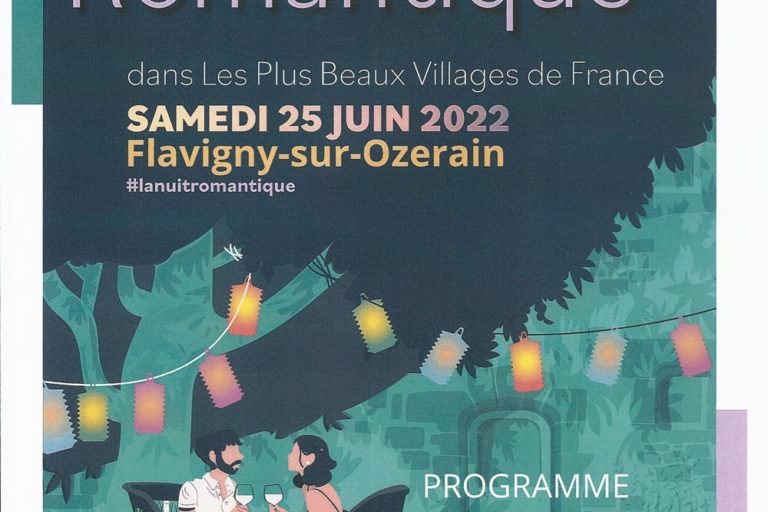 La nuit romantique Le samedi 25 juin 2022 aura lieu la soirée « La Nuit Romantique dans Les Plus Beaux Villages de France ». PROGRAMME : Jusqu’à tard dans la nuit… Déambulations dans les ruelles médiévales de Flavigny, éclairées à la bougie. Intermèdes musicaux ou littéraires, Tables romantiques, Bulles et délicatesses, Promenades en calèche… Pour…